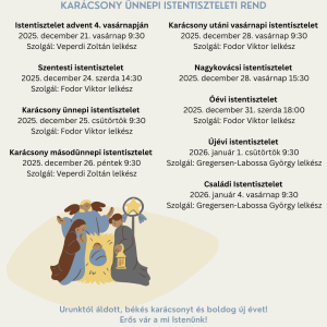 Folytatandó azt a gyakorlatot, amelyet a Covid időszak kényszerített ránk, amikor csak ebbe az irányba távozhattunk a templomból. Akkor is tapasztalhattuk, mennyivel barátságosabb egy ilyen helyen oldottan beszélgetve időt tölteni, mint a templomból távozás közben az otthon lépcsőjén. Havonta legalább egyszer szánjunk kicsit több időt ismerkedésre, beszélgetésre egy pohár tea és sütemény mellett, ezzel iserősítendő a közösségi összetartozást!!!